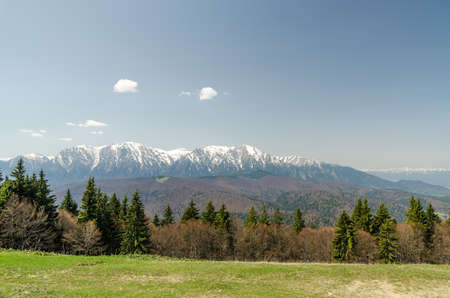 winter landscape in Postavaru Mountains, Romania. In background Piatra Craiului Mountains