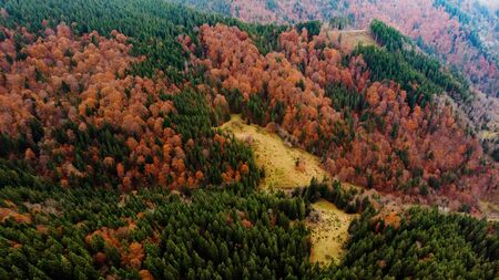 Beautiful view from a drone to a glade and autumn forest with green spruces and trees with colorful red foliage in the Carpathian mountains.