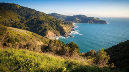 A breathtaking view of rugged coastal cliffs meeting the serene ocean waters, surrounded by lush greenery under a clear blue sky. Perfect for nature lovers.
