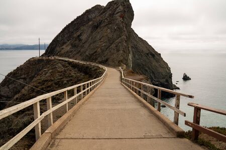 Horizontal view from path to Point Bonita Lighthouse on typical overcast, cloudy, foggy day at San Francisco Bay entrance, California, USA. Scenic stormy landscape of Pacific ocean. Travel, tourism.