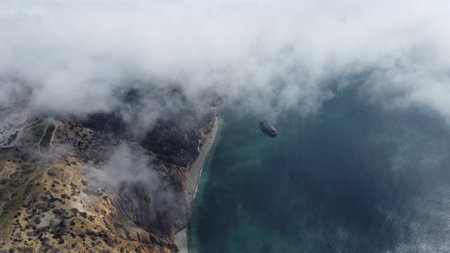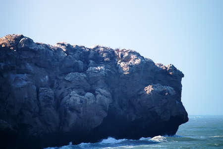 Rocky coastline of Pacific Ocean in fog. California, USA.