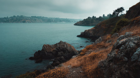 A serene landscape showcasing San Francisco Bay with the iconic Golden Gate Bridge in the distance, surrounded by lush greenery and soft fog.