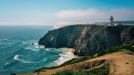 White lighthouse and adjacent house perched on a cliff, overlooking a foggy ocean, creating a serene and dramatic coastal scene