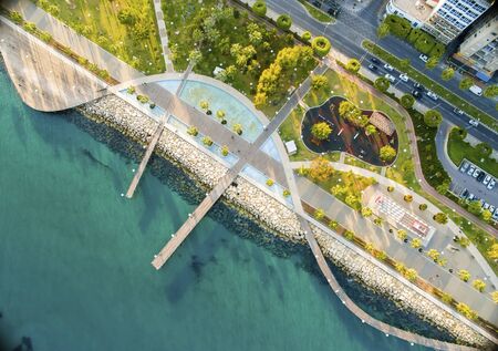 Aerial view of Molos Promenade on the coast of Limassol city in Cyprus. A view of the walk path surrounded by palm trees, pools of water, grass, boardwalk, the Mediterranean sea, piers, rocks and urban skyline.
