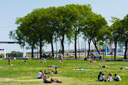 BARCELONA, SPAIN - JUNE 08, 2019: People Having Picnic And Relaxing On Summer Day In Parc de la Ciutadella Or Citadel Park In Barcelona