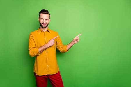 Portrait of his he nice attractive cheerful cheery guy wearing casual formal shirt showing copy space ad like follow isolated on bright vivid shine vibrant green color background