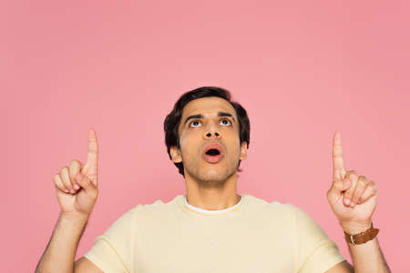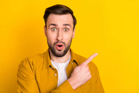 Photo of young handsome man amazed surprised point finger empty space advert choice select isolated over yellow color background