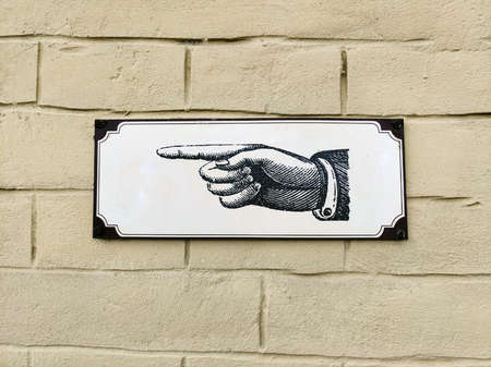 A sign with a hand drawn pointing a direction. Brick wall in the background