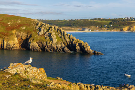 Scenic view of rocky coastline with seagull perched on rock overlooking tranquil bay in Cleden Cap Sizun, Brittany