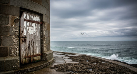 rustic stone lighthouse on a rocky cliff overlooking the ocean, created with generative ai