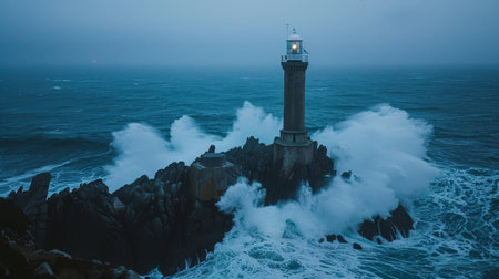 A blue hour vista captures the lighthouse enduring the ocean's wrath, with fierce swells enveloping the jagged coastline.