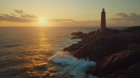 The sun sets over the ocean, casting golden hues across the waves as a lighthouse stands tall on the rocky shore, providing guidance and beauty to the coastal landscape.