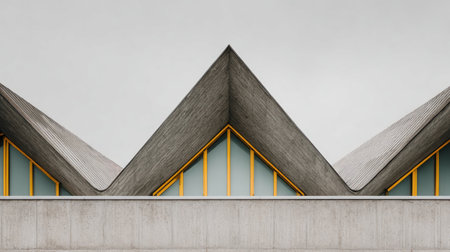 An architectural detail showcases a repeating triangular roof design with yellow framed windows. The image displays a neutral color palette with concrete textures and linear compositions. The design suggests a modern, minimalistic style. Suitable for editorial use, the image is devoid of specific locations or branding.