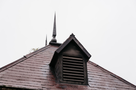decoration of the roof top with two spiers or lightning rods or finials and a lattice ridge, selective focus