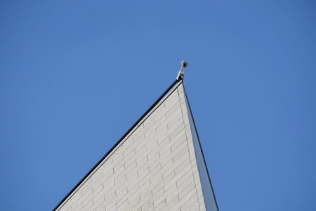 This structure features a slanted roof and expansive glass window emphasizing modern architecture. The clear sky provides a serene backdrop highlighting the buildings clean lines and style.