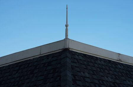 Tight shot of housetop during sunset with nice sunny blue background. Detailed building architectural abstract property closeup