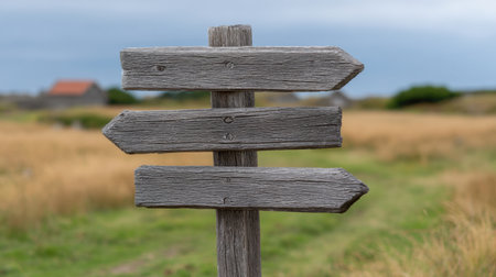 A close-up of a weathered wooden signpost featuring three arrows, set in a tranquil open field surrounded by a serene rural landscape under a cloudy sky.