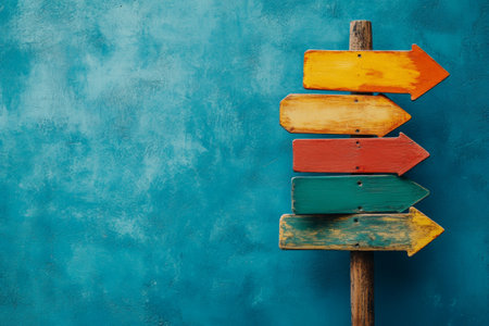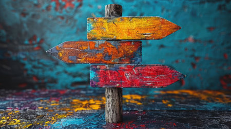 A weathered signpost adorned with bright arrows stands against an artistic backdrop.