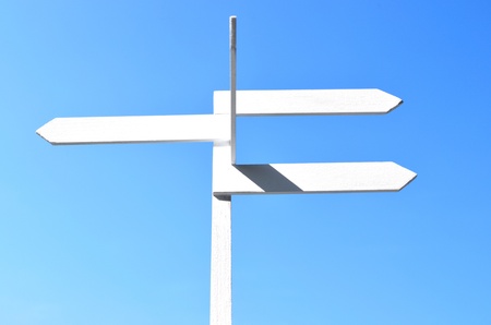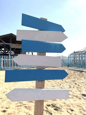 Blue and white pointer with many different directions. Copy space