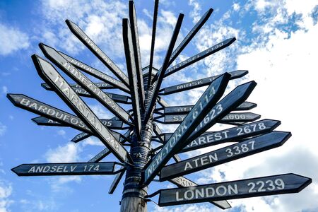 John O'Groats (Scotland), UK - August 04, 2018: Multi directional signpost at John O'Groats area, Caithness, Scotland, Highlands, United Kingdom