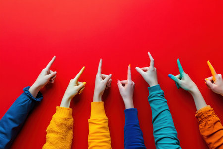 Colorful hands pointing upward against a bold red background, symbolizing communication and teamwork in a vibrant and energetic style