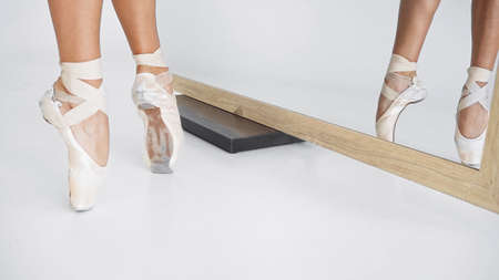 Close-up of beautiful legs of young ballerina who puts on pointe shoes on white background. Ballet dancer and practice concept background