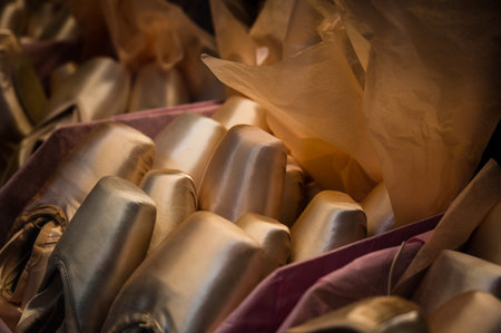 A closeup of ballerina pointe shoes in a studio