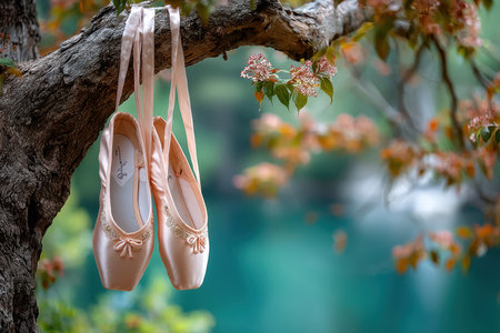 Delicate pink ballet shoes dangle from a tree branch, surrounded by soft bokeh lights in nature.