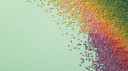 This vibrant image showcases a stunning array of colorful tiny round beads or granules scattered on a smooth green surface, creating a playful artistic pattern.