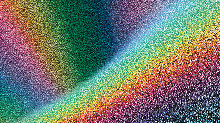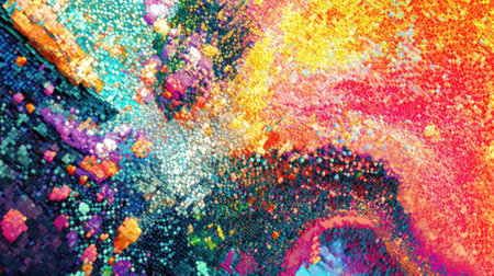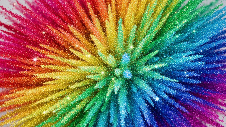 An abstract and dynamic explosion of rainbow-colored glitter particles creates a visual spectacle. The fine particles burst outwards from a central point, creating a sense of energetic movement and celebration. Each speck of glitter catches the light, producing a multitude of sparkling highlights and a shimmering, radiant effect. This vibrant and festive is backgrounds, or any concept requiring a touch of magic and joy.