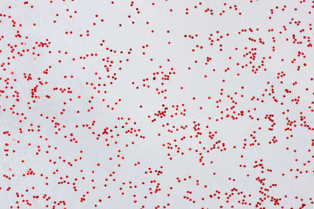 Red confetti on grey background. Christmas, winter, new year texture. Flat lay, top view