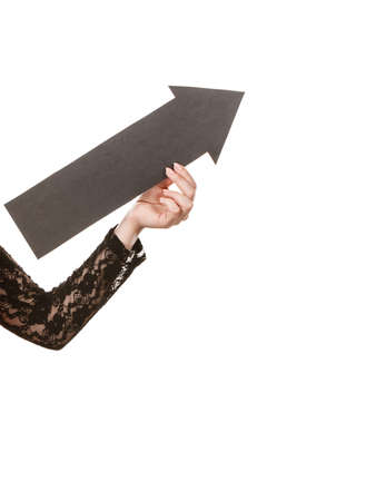 Make choice concept. Elegant woman in black with big black arrow sin symbol pointing. Young girl present show right direction to decide and solve problems.