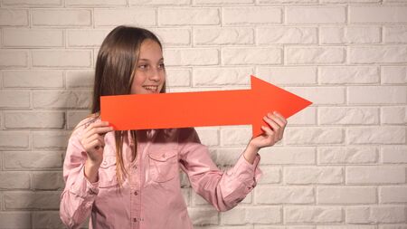 Smiling girl in pink blouse holding a banner with red arrow on the background of white brick wall
