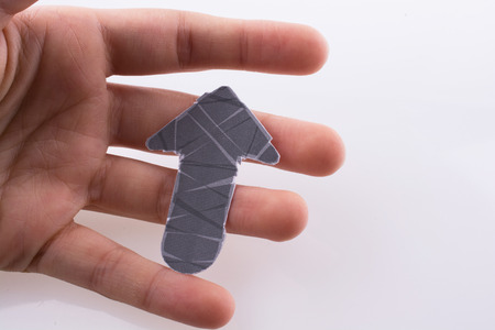 Hand holding a yellow paper arrow pointing up on white background