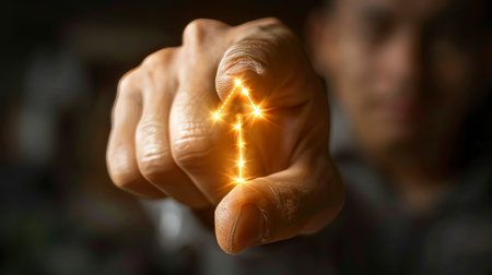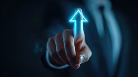 Business professional is interacting with glowing upward arrow, symbolizing growth and progress in digital environment. image conveys sense of innovation and forward thinking