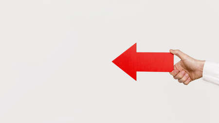 Planning, directions, choices concept. Man holding black arrow pointing left up. Indoor shot on light background