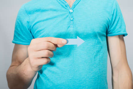 Planning, directions, choices concept. Man holding black arrow pointing right down. Indoor shot on light background