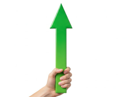 The image depicts a hand holding a large, green arrow pointing upwards against a plain white background. The hand is positioned at the bottom of the arrow, gripping it firmly. The overall composition suggests a concept of growth, progress, or positive direction.