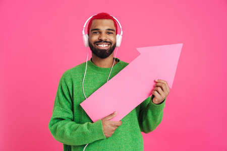 Excited young african american man 20s in casual streetwear pointing with arrow isolated on pink color background, wearing headphones