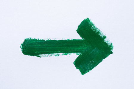 Green arrow painted with watercolor on white background as right direction, navigation element, minimalist art symbol