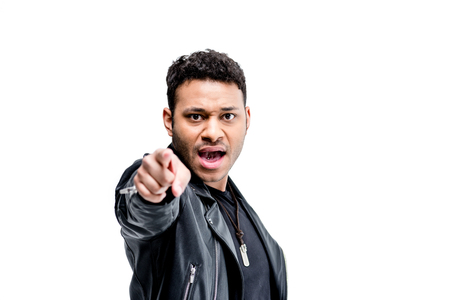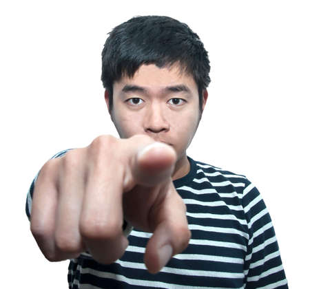 Portrait young man pointing finger at you against white background.Focused on Eyes contact. In Victim Concept.