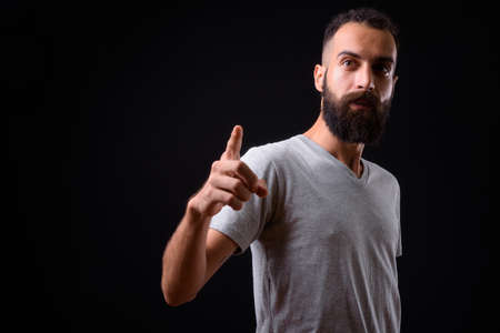 Handsome bearded man is pointing on you. Gray background. Focus on finger.