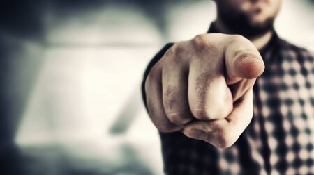 Closeup of male hand pointing finger at you.