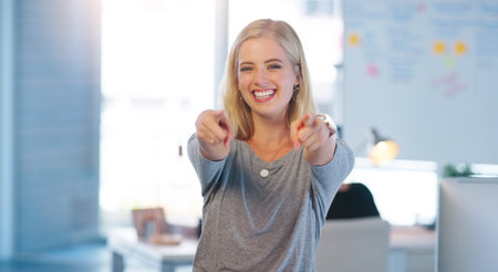 You got this. Portrait of a confident young businesswoman pointing at the camera with both of her hands inside of the office.
