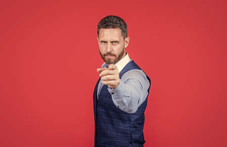 Closeup of businessman pointing finger at you.