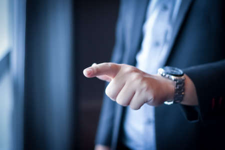 The man shows the gesture of pointing touching on the virtual screen. Investment ideas, business concepts, technology concepts.