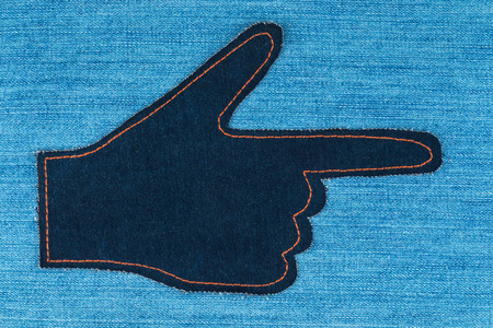 Hand in the shape a pointer made of denim jeans lies on a jeans background, with place for your text