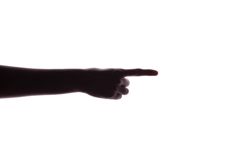Close-up of male hand showing direction with finger on white background.