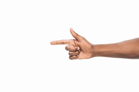 cropped shot of african american person pointing away with finger isolated on white