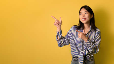 Cheerful young Asian lady pointing at free space, offering huge sale over yellow studio background, panorama